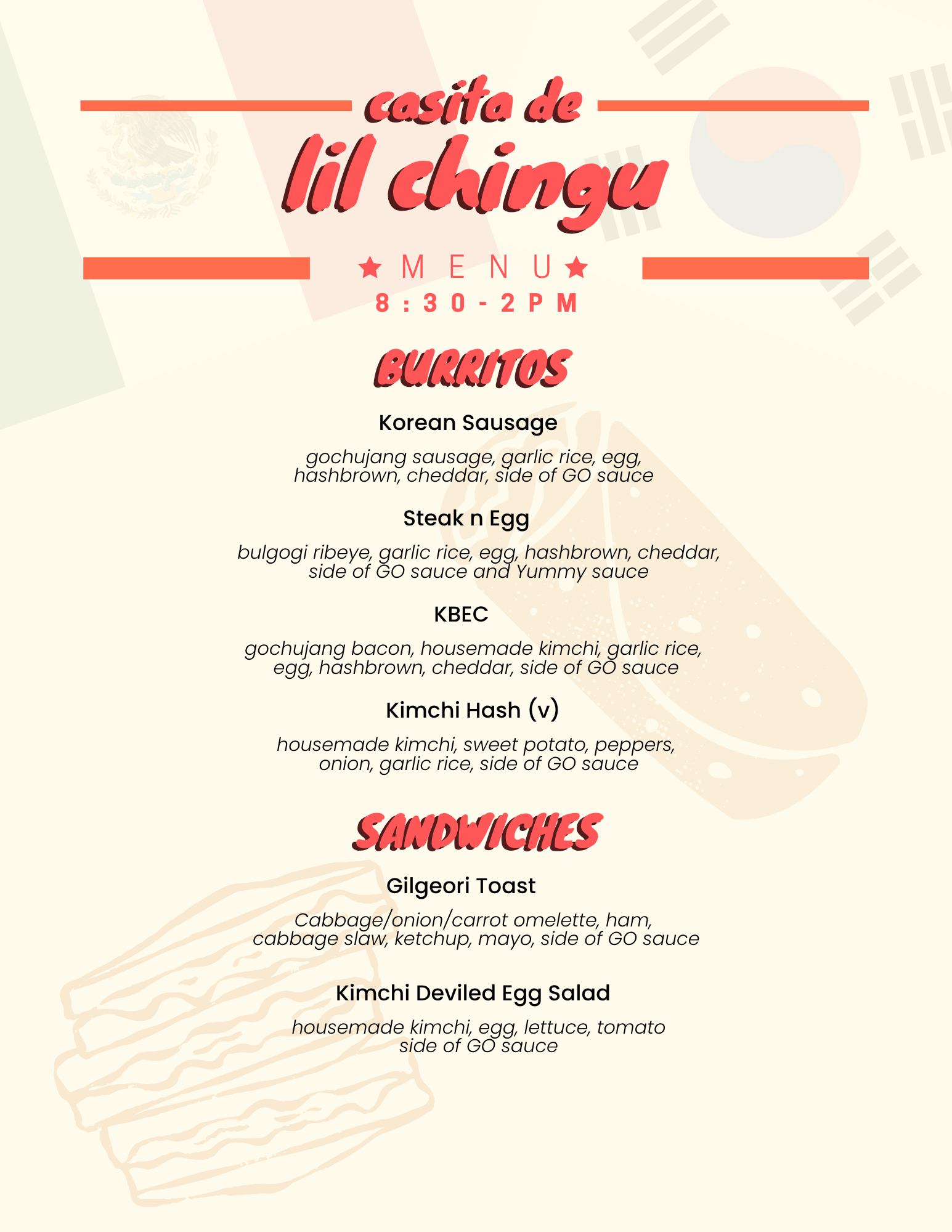 Casita de Lil Chingu is an homage to two cultures represented in our kitchen. Our hope is to honor the flavors of Korean and Mexican flavors while creating something new, fun, and delicious to serve our guests.