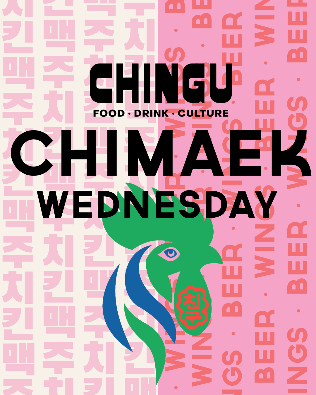 "Chicken and Beer Wednesday" at Chingu! Enjoy the beloved Korean pairing of fried chicken and beer, or "chimaek." Every week, Chef Kee Young Kim serves up a new wing flavor with a special beer pairing. Don't miss this midweek treat!